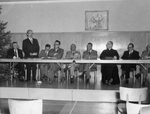 Description :SEPT DIGNITAIRES SONT DEBOUT DERRIERE LA TABLE D'HONNEUR. DE GAUCHE A DROITE: UNE FEMME ET DEUX HOMMES INCONNUS, LUCIEN CLICHE, MINISTRE DES TERRES ET FORETS, J.-ARMAND DROUIN, MAIRE DE LAC-MEGANTIC, LE CHANOINE J.-OSCAR MAUGER ET LUCIEN BEDAR...