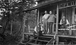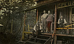 Description :VUE EN CONTRE-PLONGEE DE L'ENTREE DU CHALET EN BOIS ROND. UN HOMME ASSIS DANS L'ESCALIER AVEC UN CHIEN NOIR, DEUX HOMMES DEBOUT DEVANT LA PORTE (L'UN PORTANT UN PULL AVEC LES LETTRES ®CHC¯ BRODEES) ET, ENFIN, E.B. WORTHINGTON ASSIS SUR UNE C...