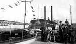 Description :UN GROUPE D'UN DOUZAINE D'HOMMES POSENT SUR UN QUAI DE BOIS A NEWPORT, VERMONT. A GAUCHE, LE BATEAU DU DOCTEUR E.J. WILLIAMS. PARMI LE GROUPE, LE CINQUIEME A PARTIR DE LA DROITE: E.B. WORTHINGTON. A L'ARRIERE-PLAN: LE BATEAU A VAPEUR LADY OF T...