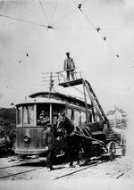 Description :TRAMWAY NO.2, UNE VOITURE TIREE PAR UN CHEVAL ET TROIS HOMMES. UN HOMME GRIMPE DANS UNE ECHELLE TRAVAILLE A INSTALLER LES FILAGES ELECTRIQUES.