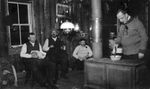 Description :GROUPE DE 5 HOMMES A L'INTERIEUR DU CAMP EN BOIS ROND. EN AVANT-PLAN, UN HOMME (PORTANT UN PULL AVEC LES LETTRES ®CHC¯ BRODEES) PRES D'UN POELE A BOIS ET RECHAUFFANT UN BOL. A L'ARRIERE, 4 HOMMES ASSIS SUR DES CHAISES. A l'EXTREMITE GAUCHE, ...