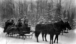 Description :4.1 - DEUX CHEVAUX ATTELES A UN TRAINEAU SUR UN CHEMIN RECOUVERT DE NEIGE. QUATRE HOMMES DANS LE TRAINEAU, MAIS DIFFICILES A IDENTIFIER. A L'ARRIERE-PLAN, LA FORET. 4.2 - VUE GENERALE DU CAMP OPEONGO DURANT L'HIVER. TOIT EN PENTE PRONONCEE ET...