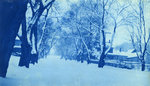 Description :VUE A PARTIR DU CENTRE DE LA RUE MONTREAL EN PENTE ASCENDANTE. DE GROS ARBRES BORDENT LES DEUX COTES DE LA RUE. PHOTOGRAPHIE PRISE APRES UNE TEMPETE DE NEIGE. A L'ARRIERE-PLAN: DES MAISONS, MAIS DIFFICILES A APERCEVOIR.