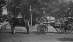 Description :VUE DES CHEVAUX ET DE LA VOITURE A INCENDIE, CHEMICAL APPARATUS, APPAREIL CHIMIQUE, 35 GALLONS D'EAU. DEUX POMPIERS FIGURENT SUR LA PHOTO. CONDUCTEUR, HERCULE CAMIRAND, FRERE DE H.D. CAMIRAND CAPT., ARRIERE, ARTHUR BOISVERT. D'APRES CARTE POST...