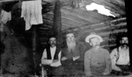Description :5.1 - QUATRE HOMMES POSANT A L'INTERIEUR D'UN CAMP EN BOIS ROND. DE GAUCHE A DROITE: BOB SCOTT; UN HOMME INCONNU PORTANT UNE LONGUE BARBE; E.B. WORTHINGTON; ET UN AUTRE HOMME PORTANT UNE TRES GROSSE MOUSTACHE. A L'AVANT-PLAN: LA PARTIE D'UNE T...