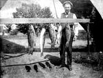 Description :A L'EXTERIEUR, CINQ GROS POISSONS SUSPENDUS (DES PERCHES) A UNE POUTRE DE BOIS RETENUE PROVISOIREMENT PAR LE MANCHE D'UN COUPE-GAZON MANUEL. DERRIERE, UN HOMME TENANT UNE CANNE A PECHE. IL PORTE UNE CHEMISE AVEC UN NOEUD PAPILLON, UN CHAPEU ET...