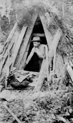 Description :14.1 - E.B. WORTHINGTON A L'INTERIEUR D'UN CAMP FABRIQUE EN BOIS ET EN BRANCHES DIVERSES. LE TOUT FORMANT UNE TENTE. A L'EXTERIEUR DU CAMP DE FORTUNE, APPUYES SUR LES MONTANTS, UNE CARABINE. E.B. WORTHINGTON PORTE UN CHAPEAU ET OBSERVE A L'EXT...