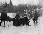 Description :DANS UN DECOR ENNEIGE, DEUX CHEVAUX ATTELES A UN TRAINEAU SE SONT ENFONCES DANS LA NEIGE. TROIS HOMMES PORTANT DES RAQUETTES REGARDENT LA SCENE EN SE DEMANDANT ®QUOI FAIRE?¯. L'UN D'EUX PORTE LES HABITS DU SHERBROOKE SNOW SHOE CLUB.