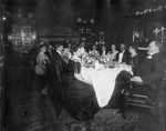 Description :DANS UNE RESIDENCE,UN GROUPE DE DOUZE PERSONNES EN COSTUME DE SOIREE RASSEMBLEES AUTOUR D'UNE TABLE. PRESENCE DE TROIS VAISSELIERS ET D'UN FOYER. DE GAUCHE A DROITE: RUBY HUNT; CHARLIE FRASER; ALPIE HOOD; LOUISE MOREY; EMMA MAY L'EPOUSE DE ART...