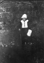 Description :DEVANT UN MUR DE PIERRES SUR LEQUEL S'ACCROCHE DE LA VEGETATION, UNE PETITE FILLE POSANT DEBOUT. ELLE EST VETUE D'UN CHAPEAU BLANC ET D'UNE VESTE ARBORANT DE LA FOURRURE BLANCHE. ELLE TIENT, D'UNE MAIN, UN MANCHON EN FOURRURE BLANCHE ET, DE L'...