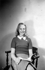 Description :PATRICIA PRENANT LA POSE, ASSISE SUR UNE CHAISE ET TENANT UN LIVRE SUR SES CUISSES. ELLE PORTE UNE JUPE ET UN CHANDAIL A COL BLANC. UN PETIT ECUSSON DE L'UNION JACK SUR SON CHANDAIL.