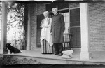 Description :SUR UNE GALERIE EN BOIS, A L'EXTERIEUR, UN HOMME AGE ET SON EPOUSE, EGALEMENT AGEE, DEBOUT ET PRENANT LA POSE. A L'EXTREMITE GAUCHE, UN PETIT CHIEN NOIR.