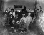Description :RASSEMBLES DANS UN ETROIT SALON, DEBOUT: DR. E.J. WILLIAMS ET MISS MACKAY. ASSIS: E.B. WORTHINGTON, MME WILLIAMS, RUBY HUNT, MME ?, DOLLY GWYN, E. FRASER. A L'AVANT: FRANK CAUSTON ET JIM MORKILL. LE SOL EST RECOUVERT D'UNE MOQUETTE ET SUR LES ...