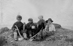 Description :QUATRE JEUNES GARCONS ASSIS EN DEMI-CERCLE SUR UN SOL COUVERT D'HERBE ET DE GRAVIER. DEUX D'ENTRE EUX TIENNENT DE GRANDES HACHES ALLONGEES PRES DE LEURS PIEDS. TROIS D'ENTRE EUX TIENNENT EGALEMENT DES BOUTEILLES EN VERRE, TANDIS QU'UN DERNIER ...