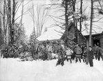 Description :1.1 - UN GROUPE DU SHERBROOKE SNOW SHOE CLUB PHOTOGRAPHIE EN COMPAGNIE DE MEMBRES DU QUEBEC SNOW SHOE CLUB LORS DE LEUR VISITE A SHERBROOKE. EN ARRIERE-PLAN: LE CHALET DU SHERBROOKE SNOW SHOE CLUB, SUR LA RUE PROSPECT. PARMI LE GROUPE: E.B. WO...