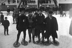 Description :ALIGNEMENT DES COUREURS PORTANT RAQUETTES SUR L'ANNEAU DE COURSES DU PLATEAU PARC. DE DROITE A GAUCHE: L'AVOCAT EMILE RIOUX, CHARLES-EMILE GATIEN, LE NOTAIRE E.B. WORTHINGTON, ET LEANDRE PROULX.