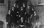 Description :GROUPE D'ETUDIANTS EN COSTUME TROIS-PIECES DEBOUT DANS UN ESCALIER. NEUF D'ENTRE EUX ENTOURENT NORREYS ASHETON WORTHINGTON, ET PLUSIEURS LE POINTENT DE L'INDEX. ASHETON EST ASSIS PAISIBLEMENT DANS L'ESCALIER LES MAINS JOINTES. SUR LA PHOTO, AS...