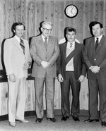 Description :QUATRE HOMMES EN HABIT PRENNENT LA POSE. DE GAUCHE A DROITE: PIERRE LEMAIRE, LUCIEN BEDARD, GERARD FRADET ET SERGE MENARD. EN ARRIERE-PLAN, UNE HORLOGE.