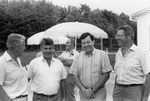 Description :25.1 - DE GAUCHE A DROITE: CHARLES AUGUSTE DESROCHERS, GERARD FRADET, SERGE MENARD ET UN HOMME INCONNU. EN ARRIERE-PLAN, CAMILLE ROUILLARD, DEUX PARASOLS ET UN TERRAIN DE TENNIS. 25.2 - GROUPE D'HOMMES REPARTIS SUR DEUX RANGEES PRES D'UNE TABL...
