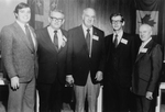 Description :GROS PLAN SUR CINQ HOMMES. DE GAUCHE A DROITE: GUY GAUVIN, DIRECTEUR DU SERVICE DES COMMUNICATIONS DE L'A.M.B.S.Q.; LUCIEN BEDARD, SYLVESTER REDMOND, NOUVEAU PRESIDENT DE L'ASSOCIATION FORESTIERE DES CANTONS DE L'EST, FABIEN ROY, CHEF DU CREDI...