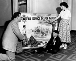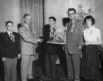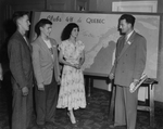 Description :GROS PLAN SUR TROIS GAGNANTS DE CONCOURS LORS DU CONGRES PROVINCIAL DES CLUBS 4-H EN 1948. DE GAUCHE A DROITE: PHILIPPE DORAIS, VICTOR MARCHESSAULT ET PIERRETTE MENARD. A DROITE, LUCIEN BEDARD. EN ARRIERE-PLAN, UN CARTE INDIQUE LES CLUBS 4-H D...
