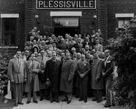 Description :MEMBRES DE L'ASSOCIATION FORESTIERE DES CANTONS DE L'EST DEVANT L'HOTEL DE VILLE DE PLESSISVILLE QUE L'ON APERCOIT EN PARTIE. PARMI EUX: ROGER-R. COTE, LUCIEN BEDARD, FERNAND DRAPEAU, J. RISI, G.-M. STEARNS, J.-E. FOURNIER, J.A. SAVOIE, J.A. S...