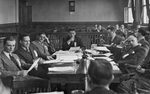 Description :51.1 - HUIT HOMMES EN HABIT SONT ASSIS AUTOUR D'UNE TABLE. EN ARRIERE-PLAN, D'AUTRES HOMMES PLUS LOIN. EN AVANT-PLAN, LA TETE D'UN HOMME ET UNE CLOCHE. A NOTER, LA SCENE SE DEROULE A L'HOTEL DE VILLE DE SHERBROOKE. 51.2 - QUATRE HOMMES EN HABI...