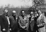 Description :CINQ HOMMES EN HABIT POSENT DEVANT DES ARBRES. DE GAUCHE A DROITE: LUCIEN BEDARD, ANTONIO PINARD, ECHEVIN, ANDRE CARRON, DIRECTEUR DES SERRES, ROGER GINGUES, ECHEVIN ET REGINALD ST-LAURENT, ECHEVIN.