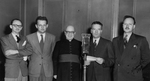 Description :CINQ HOMMES DERRIERE UN MICRO DE CHLT. DE GAUCHE A DROITE: ANTONIO BEGIN, LUCIEN BEDARD, MGR IRENE PINARD, LE DR LASALLE LABERGE, DIRECTEUR MEDICAL DU SANATORIUM ST-FRANCOIS, ET JEAN-LOUIS GAUTHIER, DIRECTEUR DES PROGRAMMES A CHLT.