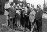 Description :NEUF HOMMES ENTOURENT UN CHENE ROUGE DEVANT UN HLM POUR PERSONNES AGEES A MAGOG. LE PREMIER A GAUCHE AVEC DES LUNETTES DE SOLEIL EST LUCIEN BEDARD. JACQUES BOISVERT EST DERRIERE L'ARBRE A DROITE.