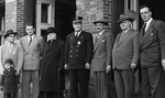 Description :SEPT HOMMES ET UN ENFANT DEVANT UN BATIMENT. PARMI LES HOMMES: LUCIEN BEDARD (2EME), LE CURE DOLOR BIRON (3EME), LE CHEF DE POLICE EDOUARD MOREAU (4EME), LE CONSEILLER MUNICIPAL ARMAND NADEAU (5EME) ET ADELARD DUPUIS (6EME).