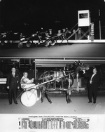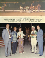 Description :PHOTOGRAPHIE DIVISEE EN DEUX. EN HAUT, LA POULICHE HANDLE WITH CARE ET SON CONDUCTEUR FRANCHISSENT LA LIGNE D'ARRIVEE. EN BAS, UN GROUPE DE 15 PERSONNES POSANT DEBOUT EN DEMI-CERCLE SUR LA PISTE DE L'HIPPODROME. PARMI LE GROUPE, WILLIAM HAUGHT...