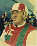 Description :PHOTO EN BUSTE D'UN CONDUCTEUR DE COURSE SOUS HARNAIS NON IDENTIFIE VETU DE SA VESTE (ROUGE, VERTE ET BLANCHE) ET DE SON CASQUE (ROUGE ET BLANC). SUS SA VESTE, LES INITIALES JC. DERRIERE, DES SPECTATEURS ET UN EDIFICE VITRE RENFERMANT LES ESTR...