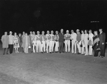 Description :ALIGNES, DEBOUT SUR UNE PISTE DE COURSE EN TERRE BATUE, UN GROUPE DE VINGT-DEUX PERSONNES PREND LA POSE. PARMI LE GROUPE, HUIT CONDUCTEURS DE COURSE SOUS HARNAIS, DONT L'UN RECOIT UN TROPHEE. A L'EXTREME GAUCHE, REDMOND HAYES QUI PORTE UN IMPE...
