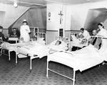 Description :QUATRE LITS SUR LESQUELS SONT ALLONGES DES MALADES OCCUPENT LA PLUS GRANDE PARTIE DE LA SALLE COMMUNE. AU FOND A GAUCHE, DEUX HOMMES ATTABLES JOUENT AUX CARTES. DEUX INFIRMIERES ET UN INFIRMIER PRODIGUENT DES SOINS AUX MALADES. SUR LE MUR D...