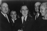 Description :CINQ HOMMES POSANT DEBOUT EN COMPLET ET CRAVATE. DE GAUCHE A DROITE: UN HOMME NON IDENTIFIE; SARTO ROY; JEAN PROSPER GAUTIER; REDMOND HAYES; ET UN AUTRE HOMME NON IDENTIFIE. SUR LA PHOTO, SARTO ROY TIENT UNE FEUILLE DE PAPIER ET SERT LA MAIN A...