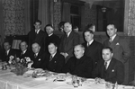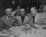 Description :GROUPE D'HOMMES RASSEMBLES DERRIERE UNE TABLE PREPAREE A RECEVOIR UN REPAS. RANGEE ASSIS, DE GAUCHE A DROITE: TED WALSH; D.J. MCMANAMY; BUZ O'MARA; FRANKIE MITTON; FRERE O'KEEFE; ET AUSTIN WORKMAN. RANGEE DE DERRIERE, DEBOUT: HARRY ALLEN; FRER...