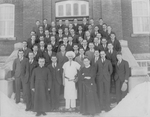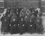 Description :GROUPE D'HOMMES PLACES SUR LES MARCHES EXTERIEURES DEVANT LA VILLA SAINT-ALPHONSE. DEUX PERES REDEMPTORISTES SONT ASSIS SUR DES CHAISES, A L'AVANT-PLAN. LE REDEMPTORISTE DE GAUCHE EST PROBABLEMENT DONAT VEZINA. AU DEUXIEME RANG, LE SIXIEME EST...