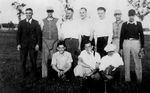 Description :GROUPE D'HOMMES SUR UN TERRAIN GAZONNE. PREMIERE RANGEE, ACCROUPIS, DE GAUCHE A DROITE: LAURENT SAVAGE; LAURENT BOISVERT; GERARD ARCHAMBAULT. DEUXIEME RANGEE, DEBOUT: ALFRED SAVAGE; C. CLARK; UN HOMME NON IDENTIFIE; TOM REDMOND; JERRY LEMAY; L...