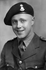 Description :PHOTO EN BUSTE DE BENNY VEILLEUX PORTANT SON COSTUME DE MILITAIRE ET UN BERET SUR LA TETE ARBORANT UN INSIGNE.