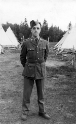 Description :PAUL GINGUES EN COSTUME DE MILITAIRE A L'EXTERIEUR, PRES D'UN CAMPEMENT. A L'ARRIERE-PLAN, QUELQUES TENTES. IL PORTE SUR LA TETE UN BERET D'AVIATEUR.