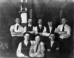 Description :GROUPE DE HUIT HOMMES PRENANT LA POSE. PREMIERE RANGEE, ASSIS, TROIS HOMMES NON IDENTIFIES. DEUXIEME RANGEE, DEBOUT, QUATRE HOMMES NON IDENTIFIES; SAUF LE DERNIER A DROITE, BILL REDMOND (IL RESSEMBLE A TOM REDMOND). QUELQUES-UNS ONT RELEVE LES...