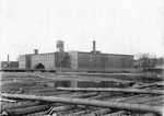 Description :VUE SUR L'ARRIERE DE LA MANUFACTURE DE PORTES ET CHASSIS AU BORD DE LA RIVIERE MAGOG. DES OUVRIERS APPARAISSENT AUX FENETRES. UNE PASSERELLE DE BOIS PERMET D'ACCEDER A L'AUTRE RIVE. A DROITE, DES PILES DE BOIS SONT ENTASSEES DANS LA COUR DE G....
