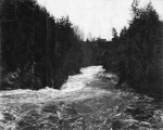 Description :GROS PLAN DE LA RIVIERE MAGOG. SUR LES DEUX RIVES, DES ARBRES. EN ARRIERE-PLAN, LE TOIT D'UNE MAISON.