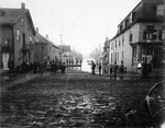 Description :LA RUE WINDSOR INONDEE VUE DE LA RUE KING OUEST. DE CHAQUE COTE DE LA RUE, DES BADAUDS REGARDENT LA SITUATION. EN ARRIERE-PLAN, DEUX CHALOUPES CIRCULENT SUR LA RUE. A NOTER, LA PRESENCE DE POTEAUX ELECTRIQUES SUR LE COTE GAUCHE DE LA RUE. PRES...