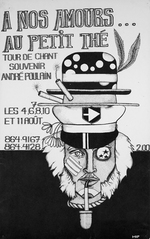 Description :GROS PLAN DU VISAGE D'UN HOMME DESSINE. CE DERNIER FUME LA PIPE, A UN MONOCLE A L'OEIL DROIT ET PORTE TROIS CHAPEAUX SUR LA TETE. DEUX BATONS DE DYNAMITE SORTENT DES CHAPEAUX. OUTRE CE DESSIN, APPARAIT SUR L'AFFICHE LE TITRE DE LA PIECE, LES D...