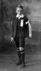 Description :PHOTO DE STUDIO AVEC DECOR DE CLAIRIERE. PRIS DE PIED EN CAP, F.A. GADBOIS SE TIENT DEBOUT, DETENDU. IL PORTE LE BRASSARD ET CARACTERISTIQUES DES ORNEMENTS DU JEUNE COMMUNIANT.