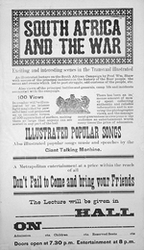 Description :1.1 SOUTH AFRICA AND THE WAR - L'ANNONCE MENTIONNE QU'IL S'AGIT D'UNE PROJECTION D'IMAGES FIXES SUR GRAND ECRAN ET QUE LE SUJET EN EST LA GUERRE DES BOERS. DES ESPACES A COMPLETER SONT LAISSES AU BAS. 1.2 THE GREAT DRAMA OF TEN NIGHTS IN A BAR...
