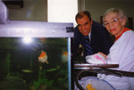 Description :BENEVOLE A L'HOPITAL DE SHERBROOKE, ROBERT GAUMONT A INSTALLE UN AQUARIUM POUR TENIR COMPAGNIE AUX PENSIONNAIRES. A DROITE, UNE PENSIONNAIRE NON IDENTIFIEE.