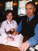 Description :LOUIS CHARLAND, PROPRIETAIRE DU RESTAURANT DA TONI ET A SA GAUCHE NICOLE STAFARO VERIFIENT LE LIVRE DE RESERVATIONS DU RESTAURANT. A L'ARRIERE-PLAN, LE BAR.